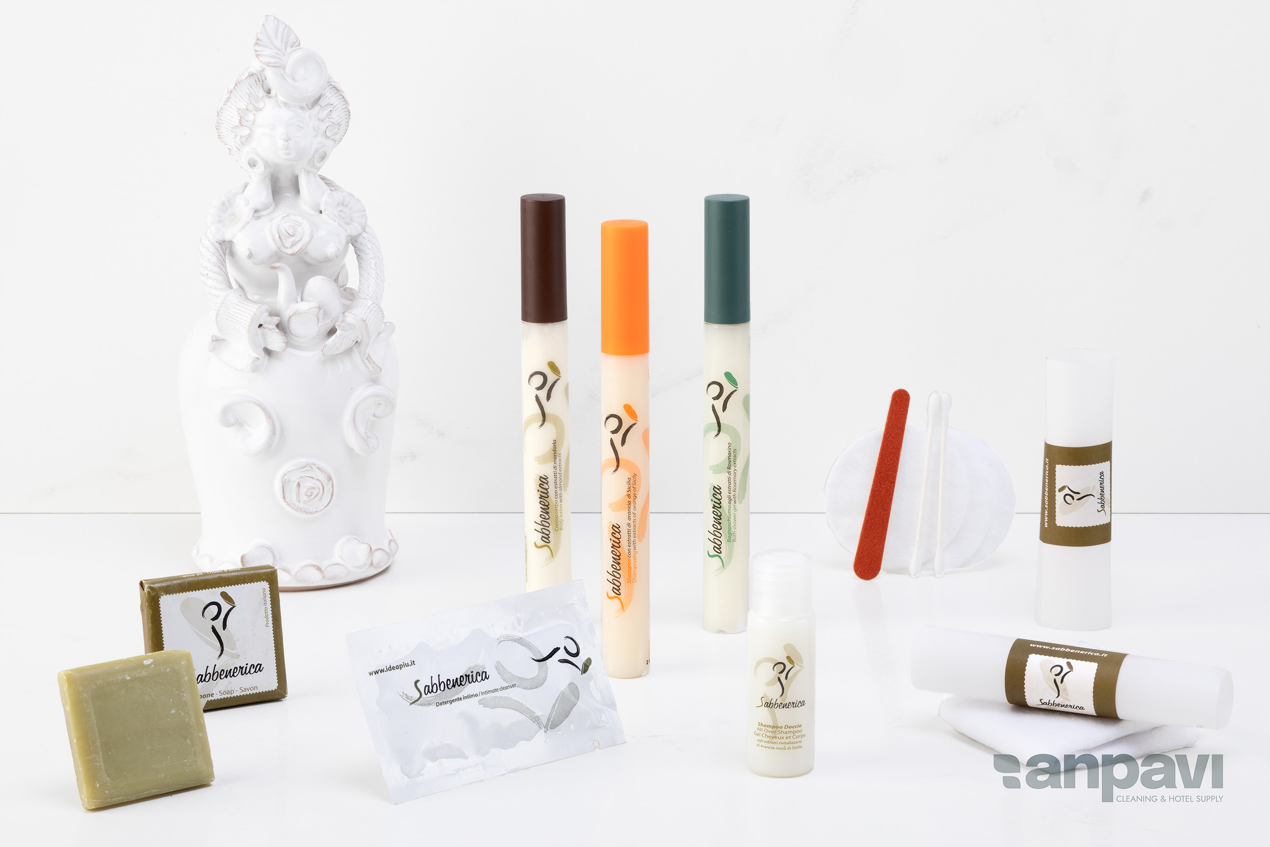 La linea di cortesia Sabbenerica ti invita a scoprire una vasta gamma di prodotti rigeneranti e rinfrescanti, pensati per offrire una cura personale impeccabile nelle strutture ricettive. Ogni prodotto è attentamente formulato con ingredienti naturali e nutrienti provenienti dalle spiagge sabbiose, per regalare ai tuoi ospiti una sensazione di freschezza e benessere. La linea di Cortesia per Hotel Sabbenerica comprende shampoo che deterge delicatamente e dona vitalità ai capelli, balsamo che idrata e ammorbidisce, saponi che purificano la pelle e lozioni per il corpo che idratano e rigenerano in profondità, set viso e molto molto latro. Ogni prodotto è arricchito con ingredienti rigeneranti, selezionati per nutrire la pelle e i capelli, lasciando una sensazione di puro rinfresco.